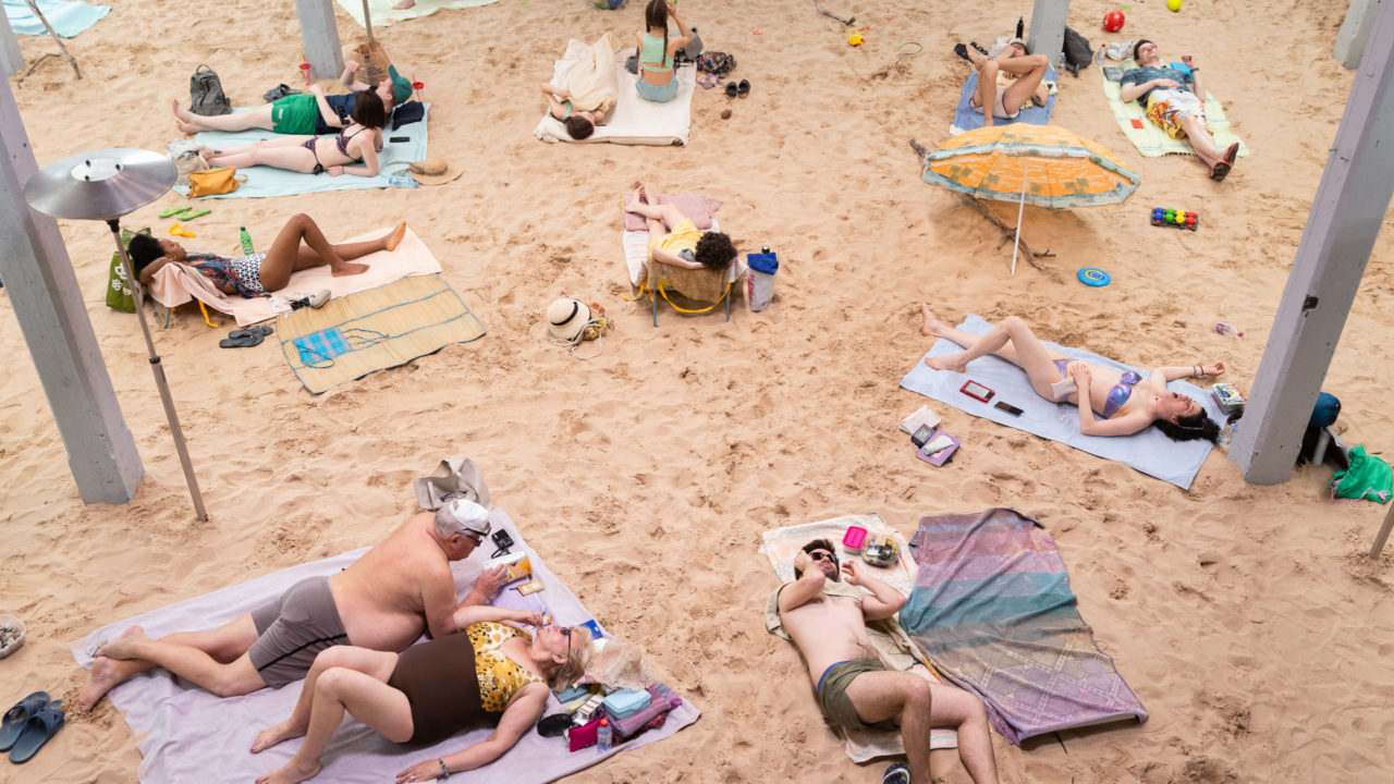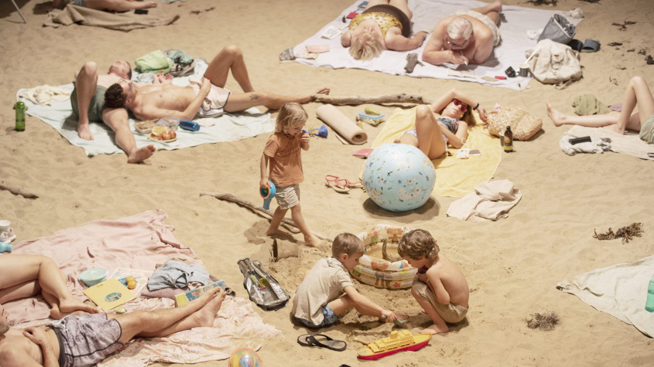 A crowded beach, the burning sun, bright bathing suits and sweaty brows and legs. Tired limbs sprawling lazily across a sea of towels. The rumble of a volcano, or of an airplane, or a speedboat. The squeal of children, laughter, the sound of an ice cream van in the distance. Sunbathers sing languid songs of worry, of boredom, of almost nothing. Songs of early morning flights and half-eaten sandwiches in the sand, the crinkling of plastic bags whirling in the air then floating silently, jellyfish-like below the waterline.